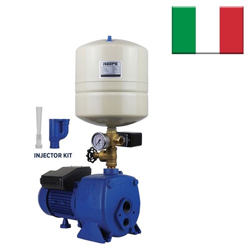 Exceptional quality, heavy duty, European manufactured high demand, self-priming centrifugal pump supplied with external injector. Suitable for water supply in household and rural systems. Available with pressure switch and tank