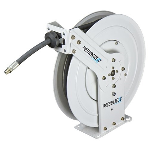 RETRACTA Heavy Duty twin pedestal spring rewind Oil reel of hose, BSPF inlet fitting, and BSPT M hose end.